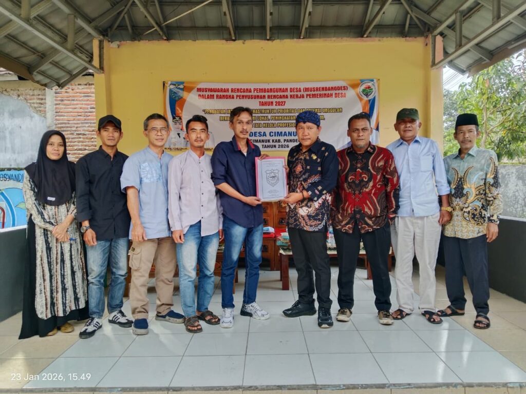 Cimanuk 2026 – Pemerintah Desa Cimanuk melaksanakan kegiatan Musrenbangdes Tahun 2026, kegiatan ini Sebagai narasumber oleh Plt. Camat Cimanuk, Kasi Pembangunan Kecamatan Cimanuk dan PLD Cimanuk. Turut hadir adalah BPD Cimanuk, Ketua TP PKK Desa Cimanuk, seluruh Ketua RT, RW, Satlinmas se-Desa Cimanuk, Kader Posyandu dan Tokoh Masyakarat. 1. Pengertian Musrenbangdes Musrenbangdes merupakan wadah partisipasi […]